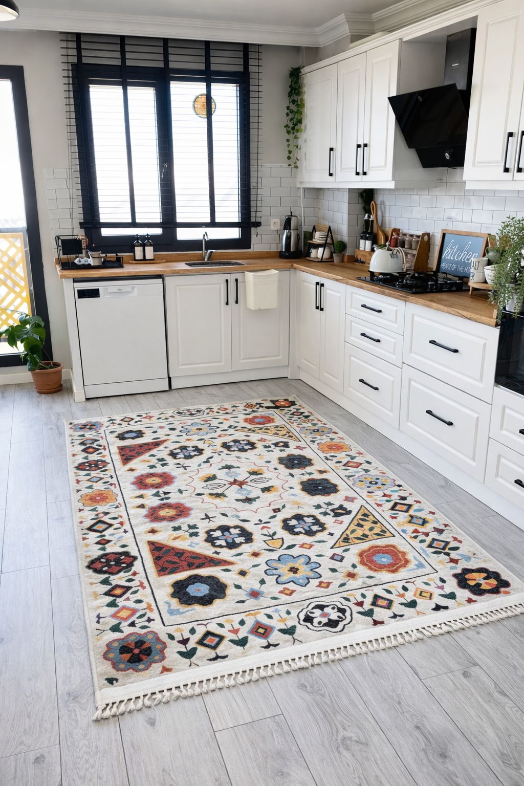 Hem makinede yıkanıyor hem de leke tutmuyor. Mutfak için en ideal tasarım kilim bu olabilir, herkese öneririm.