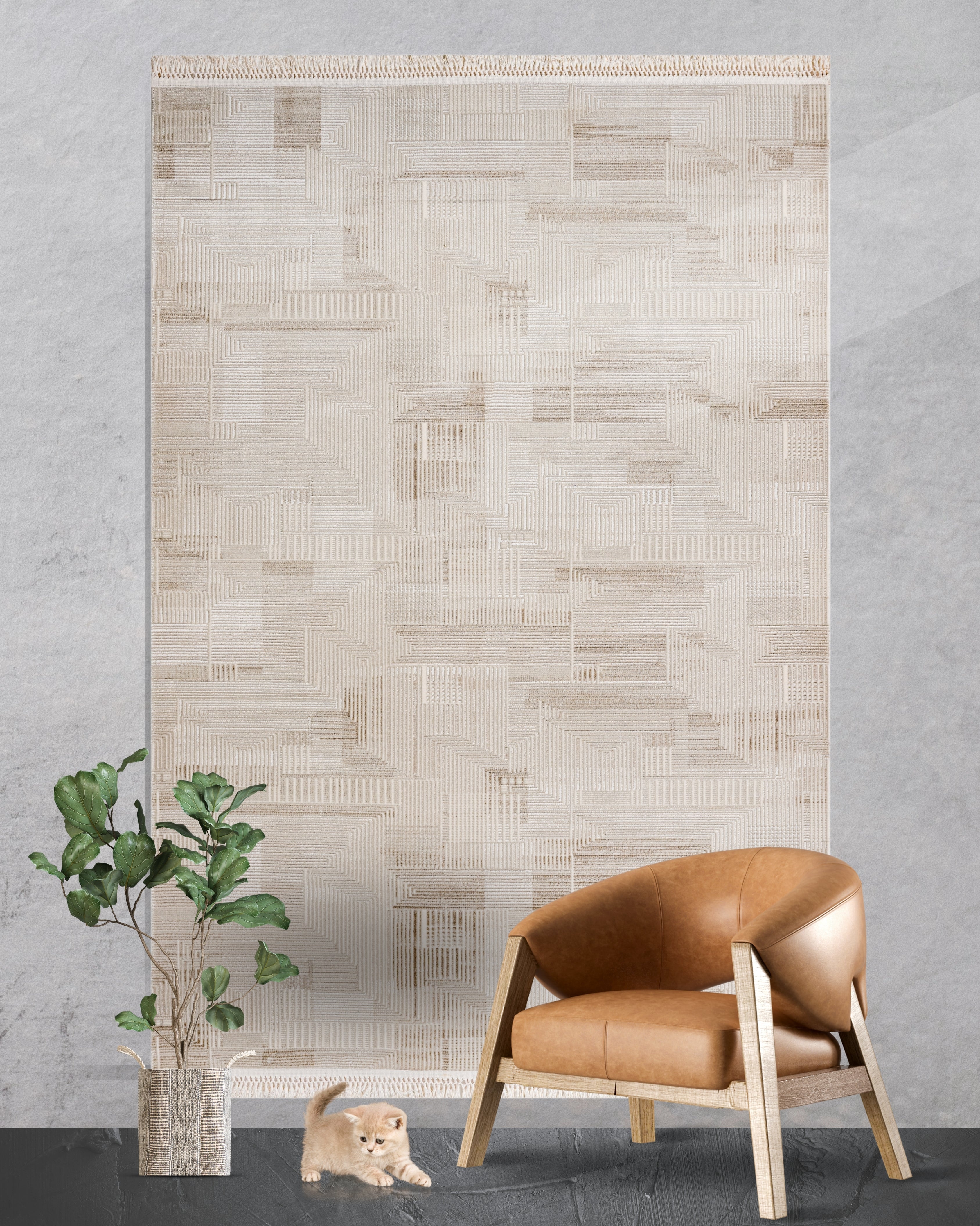 Pare Serisi Geometrik Desenli Makine Halısı Bej